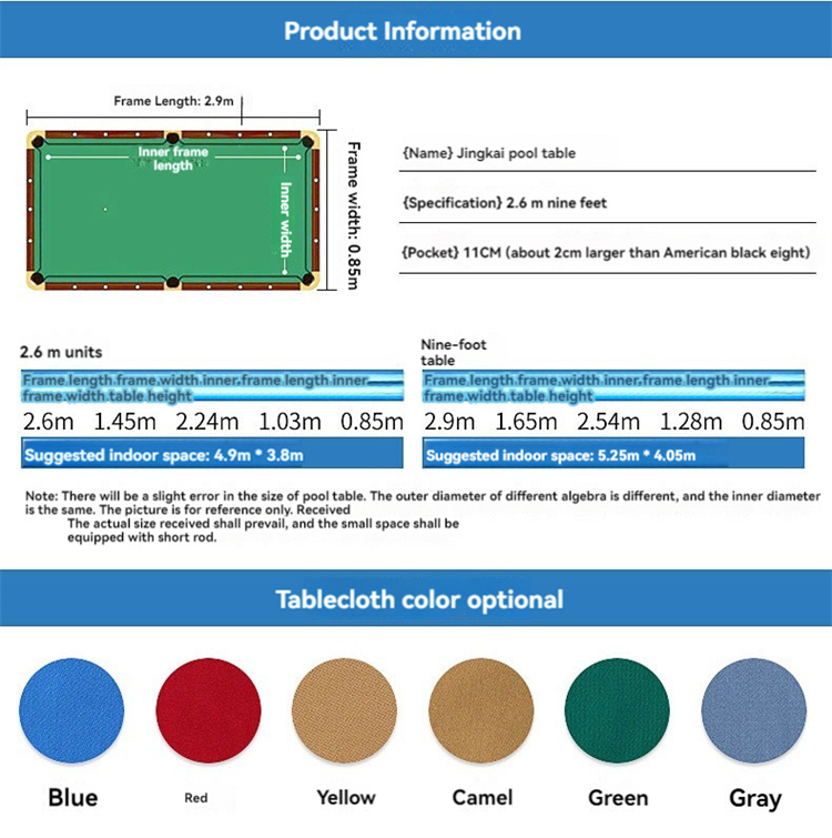| Material: Solid wood+slate Dimension: 7ft:233*133.5*85cm 8ft: 258*146*85cm 9ft:290*162*85cm Weight: Table top thickness: 2.5cm Play area:7ft:205*100cm 8ft:225*113cm 9ft:257*129cm 7ft suitable room size:397*498cm 8ft suitable room size:440*550cm 9ft suitable room size:460*590cm Color:red,blue,green/customized | Wooden Package Size: 8ft: 270*117*102cm 157*40*24cm 157*40*24cm 9ft: 1.6*1*1米 2.8*0.45*0.4米 2.75*0.65*0.12米 weight: 550 1pc/3ctns | 1 | 7ft: 1528/pc 8ft:1528/pc 9ft:1648/pc |